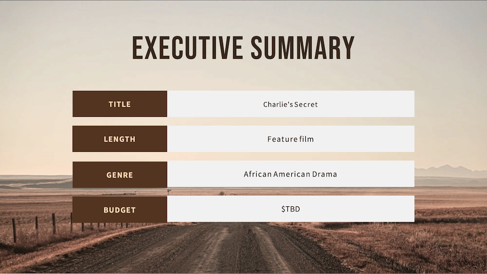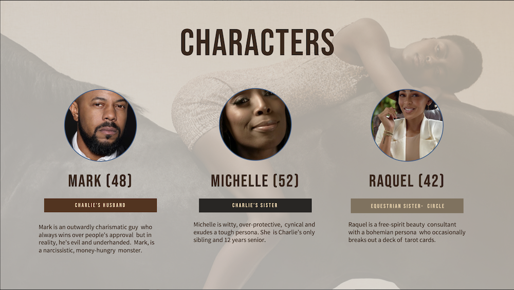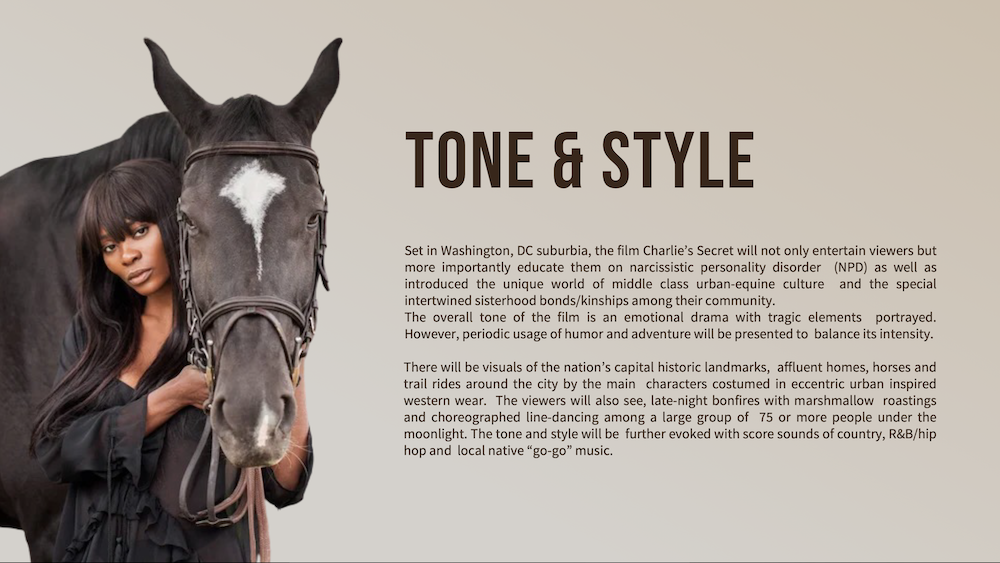 We carefully curated a sophisticated palette and refined typography to visually reflect the film’s essence. Each slide was thoughtfully composed to spotlight the characters and storyline, ensuring “Charlie’s Secret” would translate its depths to potential backers and collaborators through the visuals alone.